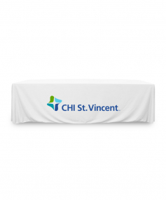 8 ft. Premium PolyKnit throw table cover with one color logo. Fits a 96 inch wide x 30 inch deep table. All corners are rounded meaning they will not gather and lay on the floor. Floor length on 4 sides. This cloth requires no ironing, is EasyCare machine washable and dryer safe.
