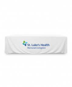 8 ft. Premium PolyKnit throw table cover with one color logo. Fits a 96 inch wide x 30 inch deep table. All corners are rounded meaning they will not gather and lay on the floor. Floor length on 4 sides. This cloth requires no ironing, is EasyCare machine washable and dryer safe.