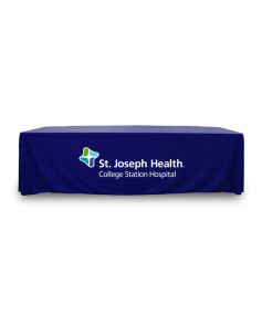 8 ft. Premium PolyKnit throw table cover with one color logo. Fits a 96 inch wide x 30 inch deep table. All corners are rounded meaning they will not gather and lay on the floor. Floor length on 4 sides. This cloth requires no ironing, is EasyCare machine washable and dryer safe.