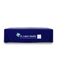 8 ft. Premium PolyKnit throw table cover with one color logo. Fits a 96 inch wide x 30 inch deep table. All corners are rounded meaning they will not gather and lay on the floor. Floor length on 4 sides. This cloth requires no ironing, is EasyCare machine washable and dryer safe.