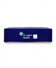8 ft. Premium PolyKnit throw table cover with one color logo. Fits a 96 inch wide x 30 inch deep table. All corners are rounded meaning they will not gather and lay on the floor. Floor length on 4 sides. This cloth requires no ironing, is EasyCare machine washable and dryer safe.