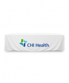 8 ft. Premium PolyKnit throw table cover with one color logo. Fits a 96 inch wide x 30 inch deep table. All corners are rounded meaning they will not gather and lay on the floor. Floor length on 4 sides. This cloth requires no ironing, is EasyCare machine washable and dryer safe.