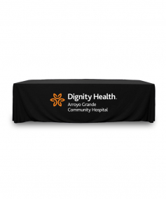 8 ft. Premium PolyKnit throw table cover with one color logo. Fits a 96 inch wide x 30 inch deep table. All corners are rounded meaning they will not gather and lay on the floor. Floor length on 4 sides. This cloth requires no ironing, is EasyCare machine washable and dryer safe.
