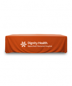 8 ft. Premium PolyKnit throw table cover with one color logo. Fits a 96 inch wide x 30 inch deep table. All corners are rounded meaning they will not gather and lay on the floor. Floor length on 4 sides. This cloth requires no ironing, is EasyCare machine washable and dryer safe.