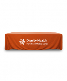 8 ft. Premium PolyKnit throw table cover with one color logo. Fits a 96 inch wide x 30 inch deep table. All corners are rounded meaning they will not gather and lay on the floor. Floor length on 4 sides. This cloth requires no ironing, is EasyCare machine washable and dryer safe.