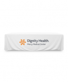 8 ft. Premium PolyKnit throw table cover with one color logo. Fits a 96 inch wide x 30 inch deep table. All corners are rounded meaning they will not gather and lay on the floor. Floor length on 4 sides. This cloth requires no ironing, is EasyCare machine washable and dryer safe.