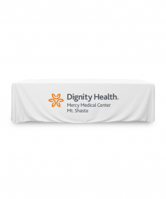 8 ft. Premium PolyKnit throw table cover with one color logo. Fits a 96 inch wide x 30 inch deep table. All corners are rounded meaning they will not gather and lay on the floor. Floor length on 4 sides. This cloth requires no ironing, is EasyCare machine washable and dryer safe.
