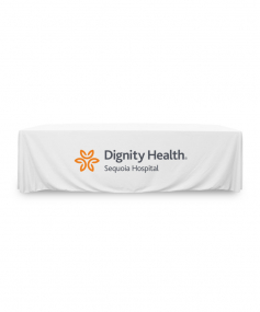 8 ft. Premium PolyKnit throw table cover with one color logo. Fits a 96 inch wide x 30 inch deep table. All corners are rounded meaning they will not gather and lay on the floor. Floor length on 4 sides. This cloth requires no ironing, is EasyCare machine washable and dryer safe.