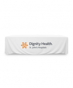 8 ft. Premium PolyKnit throw table cover with one color logo. Fits a 96 inch wide x 30 inch deep table. All corners are rounded meaning they will not gather and lay on the floor. Floor length on 4 sides. This cloth requires no ironing, is EasyCare machine washable and dryer safe.