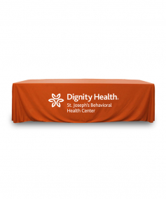 8 ft. Premium PolyKnit throw table cover with one color logo. Fits a 96 inch wide x 30 inch deep table. All corners are rounded meaning they will not gather and lay on the floor. Floor length on 4 sides. This cloth requires no ironing, is EasyCare machine washable and dryer safe.