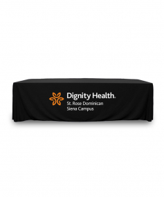 8 ft. Premium PolyKnit throw table cover with one color logo. Fits a 96 inch wide x 30 inch deep table. All corners are rounded meaning they will not gather and lay on the floor. Floor length on 4 sides. This cloth requires no ironing, is EasyCare machine washable and dryer safe.