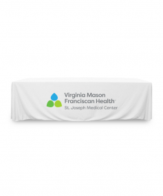 8 ft. Premium PolyKnit throw table cover with one color logo. Fits a 96 inch wide x 30 inch deep table. All corners are rounded meaning they will not gather and lay on the floor. Floor length on 4 sides. This cloth requires no ironing, is EasyCare machine washable and dryer safe.