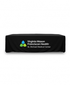 8 ft. Premium PolyKnit throw table cover with one color logo. Fits a 96 inch wide x 30 inch deep table. All corners are rounded meaning they will not gather and lay on the floor. Floor length on 4 sides. This cloth requires no ironing, is EasyCare machine washable and dryer safe.