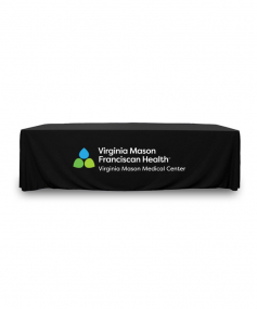 8 ft. Premium PolyKnit throw table cover with one color logo. Fits a 96 inch wide x 30 inch deep table. All corners are rounded meaning they will not gather and lay on the floor. Floor length on 4 sides. This cloth requires no ironing, is EasyCare machine washable and dryer safe.