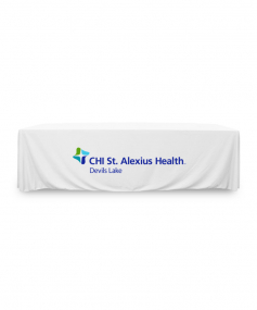 8 ft. Premium PolyKnit throw table cover with one color logo. Fits a 96 inch wide x 30 inch deep table. All corners are rounded meaning they will not gather and lay on the floor. Floor length on 4 sides. This cloth requires no ironing, is EasyCare machine washable and dryer safe.