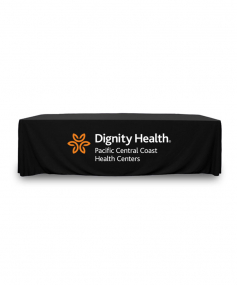 8 ft. Premium PolyKnit throw table cover with one color logo. Fits a 96 inch wide x 30 inch deep table. All corners are rounded meaning they will not gather and lay on the floor. Floor length on 4 sides. This cloth requires no ironing, is EasyCare machine washable and dryer safe.