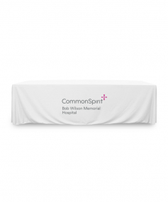 8 ft. Premium PolyKnit throw table cover with one color logo. Fits a 96 inch wide x 30 inch deep table. All corners are rounded meaning they will not gather and lay on the floor. Floor length on 4 sides. This cloth requires no ironing, is EasyCare machine washable and dryer safe.