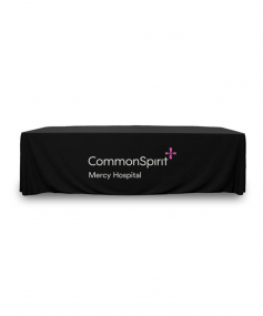 8 ft. Premium PolyKnit throw table cover with one color logo. Fits a 96 inch wide x 30 inch deep table. All corners are rounded meaning they will not gather and lay on the floor. Floor length on 4 sides. This cloth requires no ironing, is EasyCare machine washable and dryer safe.