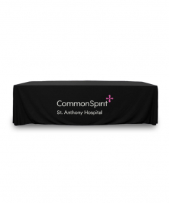 8 ft. Premium PolyKnit throw table cover with one color logo. Fits a 96 inch wide x 30 inch deep table. All corners are rounded meaning they will not gather and lay on the floor. Floor length on 4 sides. This cloth requires no ironing, is EasyCare machine washable and dryer safe.