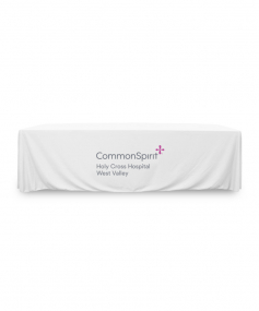 8 ft. Premium PolyKnit throw table cover with one color logo. Fits a 96 inch wide x 30 inch deep table. All corners are rounded meaning they will not gather and lay on the floor. Floor length on 4 sides. This cloth requires no ironing, is EasyCare machine washable and dryer safe.
