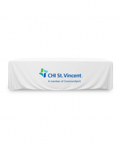 8 ft. Premium PolyKnit throw table cover with one color logo. Fits a 96 inch wide x 30 inch deep table. All corners are rounded meaning they will not gather and lay on the floor. Floor length on 4 sides. This cloth requires no ironing, is EasyCare machine washable and dryer safe.