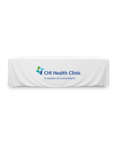 8 ft. Premium PolyKnit throw table cover with one color logo. Fits a 96 inch wide x 30 inch deep table. All corners are rounded meaning they will not gather and lay on the floor. Floor length on 4 sides. This cloth requires no ironing, is EasyCare machine washable and dryer safe.
