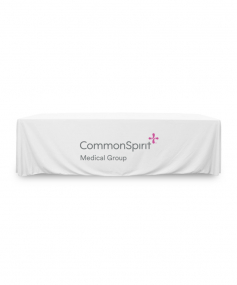 8 ft. Premium PolyKnit throw table cover with one color logo. Fits a 96 inch wide x 30 inch deep table. All corners are rounded meaning they will not gather and lay on the floor. Floor length on 4 sides. This cloth requires no ironing, is EasyCare machine washable and dryer safe.