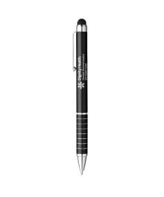 Aluminum Twist Action Ballpoint; Bold Enamel Color Finish; Shiny Silver Top, Clip, Pen Tip And Decorative Multiple Band Accents; Capacitive Soft Rubber Stylus Keeps Your Screen, Fingerprint Free! Comes With Black Ink. Complies with Prop 65. 2 1/4" W