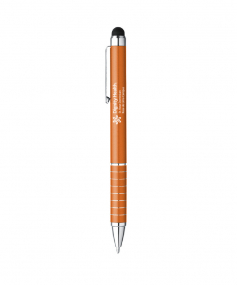 Aluminum Twist Action Ballpoint; Bold Enamel Color Finish; Shiny Silver Top, Clip, Pen Tip And Decorative Multiple Band Accents; Capacitive Soft Rubber Stylus Keeps Your Screen, Fingerprint Free! Comes With Black Ink. Complies with Prop 65. 2 1/4" W
