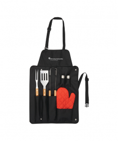 The all in one BBQ Kit Includes an apron, spatula, fork, tongs,oven mitt, and a salt & pepper shaker. These are the essentials to have a successful BBQ. Adjustable back and neck strap allow the apron to be adjusted for a comfortable day in front of the grill. Complies with Prop 65. 24" H x 19" W