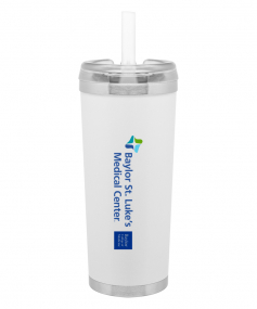 24 oz double wall 18/8 stainless steel thermal tumbler with copper vacuum insulation, stainless steel rim and base, threaded Eastman Tritan lid, snap closure, straw opening, and flexible wide silicone straw.