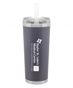 24 oz double wall 18/8 stainless steel thermal tumbler with copper vacuum insulation, stainless steel rim and base, threaded Eastman Tritan lid, snap closure, straw opening, and flexible wide silicone straw.