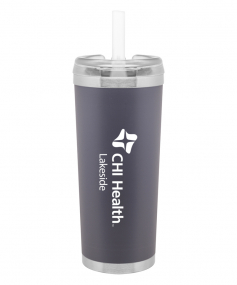 24 oz double wall 18/8 stainless steel thermal tumbler with copper vacuum insulation, stainless steel rim and base, threaded Eastman Tritan lid, snap closure, straw opening, and flexible wide silicone straw.