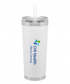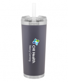 24 oz double wall 18/8 stainless steel thermal tumbler with copper vacuum insulation, stainless steel rim and base, threaded Eastman Tritan lid, snap closure, straw opening, and flexible wide silicone straw.