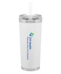 24 oz double wall 18/8 stainless steel thermal tumbler with copper vacuum insulation, stainless steel rim and base, threaded Eastman Tritan lid, snap closure, straw opening, and flexible wide silicone straw.