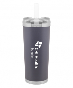 24 oz double wall 18/8 stainless steel thermal tumbler with copper vacuum insulation, stainless steel rim and base, threaded Eastman Tritan lid, snap closure, straw opening, and flexible wide silicone straw.