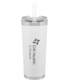 24 oz double wall 18/8 stainless steel thermal tumbler with copper vacuum insulation, stainless steel rim and base, threaded Eastman Tritan lid, snap closure, straw opening, and flexible wide silicone straw.