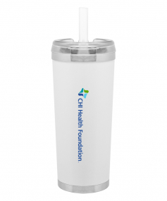 24 oz double wall 18/8 stainless steel thermal tumbler with copper vacuum insulation, stainless steel rim and base, threaded Eastman Tritan lid, snap closure, straw opening, and flexible wide silicone straw.