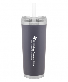 24 oz double wall 18/8 stainless steel thermal tumbler with copper vacuum insulation, stainless steel rim and base, threaded Eastman Tritan lid, snap closure, straw opening, and flexible wide silicone straw.