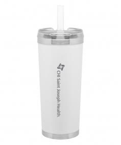 24 oz double wall 18/8 stainless steel thermal tumbler with copper vacuum insulation, stainless steel rim and base, threaded Eastman Tritan lid, snap closure, straw opening, and flexible wide silicone straw.