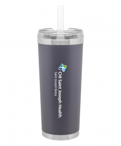 24 oz double wall 18/8 stainless steel thermal tumbler with copper vacuum insulation, stainless steel rim and base, threaded Eastman Tritan lid, snap closure, straw opening, and flexible wide silicone straw.