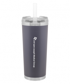 24 oz double wall 18/8 stainless steel thermal tumbler with copper vacuum insulation, stainless steel rim and base, threaded Eastman Tritan lid, snap closure, straw opening, and flexible wide silicone straw.