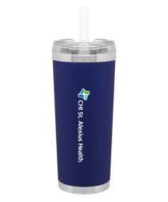 24 oz double wall 18/8 stainless steel thermal tumbler with copper vacuum insulation, stainless steel rim and base, threaded Eastman Tritan lid, snap closure, straw opening, and flexible wide silicone straw.