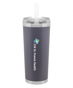 24 oz double wall 18/8 stainless steel thermal tumbler with copper vacuum insulation, stainless steel rim and base, threaded Eastman Tritan lid, snap closure, straw opening, and flexible wide silicone straw.
