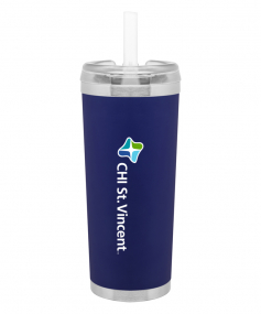 24 oz double wall 18/8 stainless steel thermal tumbler with copper vacuum insulation, stainless steel rim and base, threaded Eastman Tritan lid, snap closure, straw opening, and flexible wide silicone straw.
