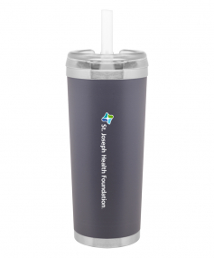 24 oz double wall 18/8 stainless steel thermal tumbler with copper vacuum insulation, stainless steel rim and base, threaded Eastman Tritan lid, snap closure, straw opening, and flexible wide silicone straw.