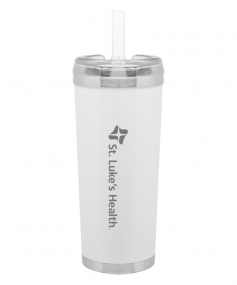24 oz double wall 18/8 stainless steel thermal tumbler with copper vacuum insulation, stainless steel rim and base, threaded Eastman Tritan lid, snap closure, straw opening, and flexible wide silicone straw.