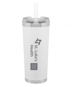 24 oz double wall 18/8 stainless steel thermal tumbler with copper vacuum insulation, stainless steel rim and base, threaded Eastman Tritan lid, snap closure, straw opening, and flexible wide silicone straw.