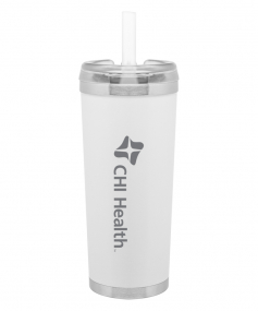 24 oz double wall 18/8 stainless steel thermal tumbler with copper vacuum insulation, stainless steel rim and base, threaded Eastman Tritan lid, snap closure, straw opening, and flexible wide silicone straw.