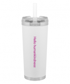 24 oz double wall 18/8 stainless steel thermal tumbler with copper vacuum insulation, stainless steel rim and base, threaded Eastman Tritan lid, snap closure, straw opening, and flexible wide silicone straw.